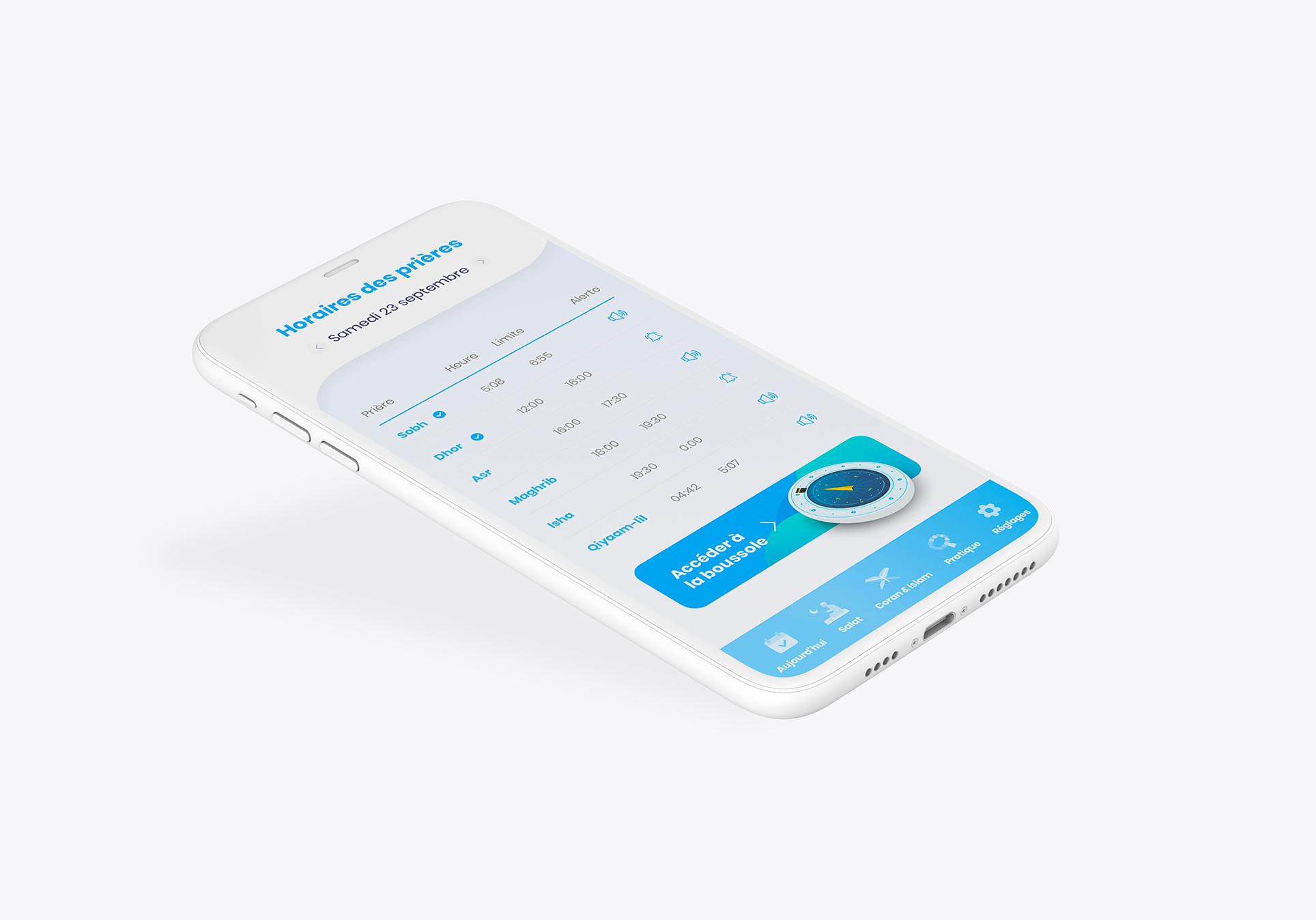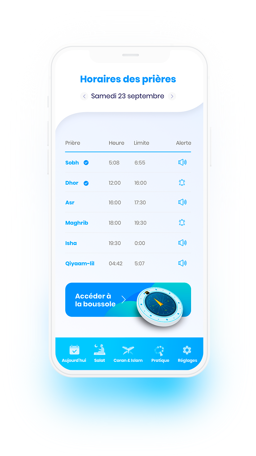 I was contacted by the Bilal Muezzin team to intervene on the visual aspect of the application. I was inspired by the latest trends in terms of UI and UX so that the alliance of my artistic direction take on meaning with Bilal Muezzin’s charter.
